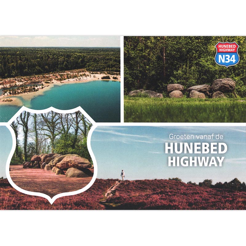 “Groeten vanaf de Hunebed Highway” ansichtkaart. De Hunebed Highway is Nederland’s beroemdste autoroute – laat zien dat je er geweest bent!