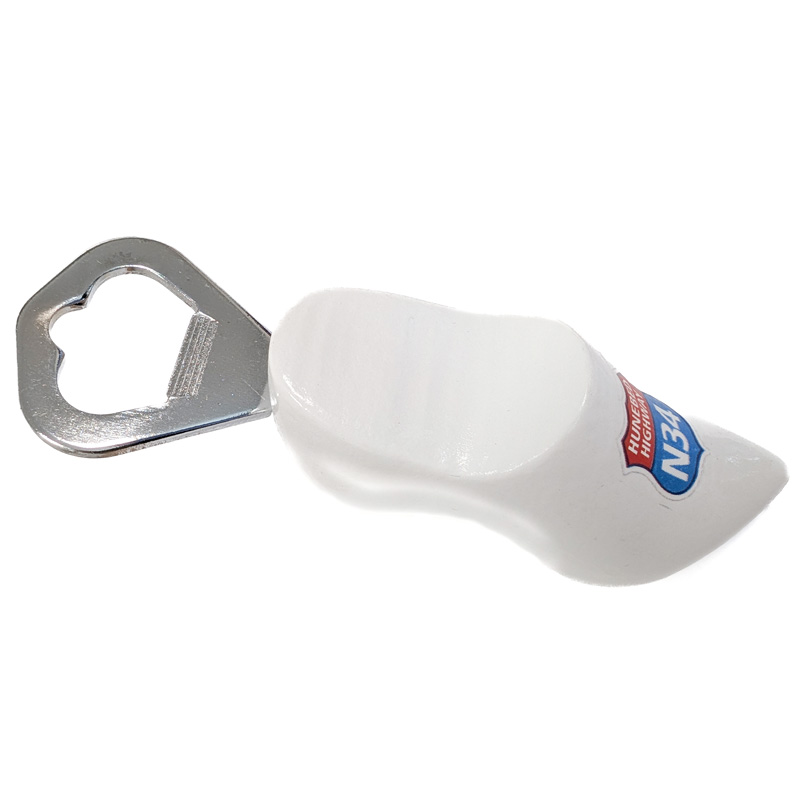 Forse houten klomp als flessenopener met opdruk van Hunebed Highway logo.